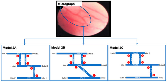 Development of models from realistic geometry for Model 2. The geometries for the initial geometry are derived from a micrograph of blood vessels in RA (permission obtained from RightsLink/Elsevier) [75]. The portion in the solid is the complete geometry for Model 2. The different variations (Model 2A, Model 2B and Model 2C) arise from rearranging inlets and outlets and placing one of the vessels at an angle.