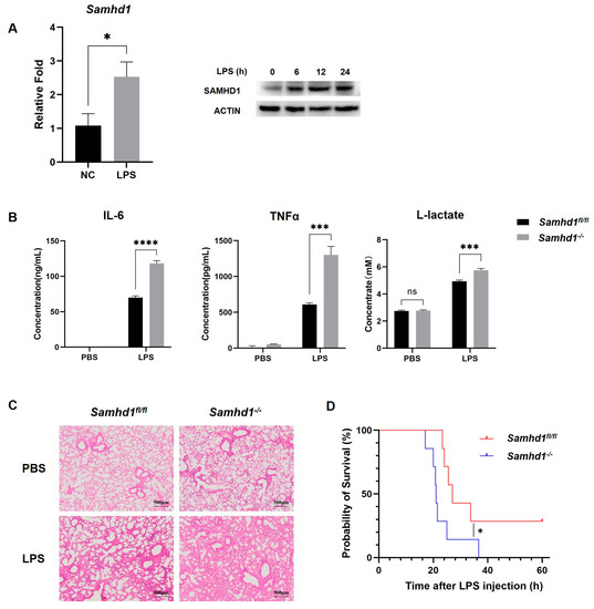 Samhd1 deficiency increases acute inflammation in LPS-induced sepsis in vivo. (A) Samhd1 mRNA expression was detected with qPCR in wild-type mice-derived peritoneal macrophages after 3 h LPS stimulation (100 ng/mL) (left) and SAMHD1 protein levels were detected with western blotting in mouse peritoneal macrophages that were stimulated with LPS for 6, 12, and 24 h (100 ng/mL) (right). * p < 0.05, Student’s t-test, n = 3/group. (B,C) Samhd1−/− and control mice were injected intraperitoneally with LPS (15 mg/kg) or PBS for 3 h. (B) The serum concentrations of IL-6, TNFα, and lactate were measured with ELISA and biochemical reagents, respectively, **** p < 0.0001, *** p < 0.001, Student’s t-test, n = 3/group, ns—not statistically significant. (C) Lung tissues of mice were collected for preparing H&E-stained sections. (D) Samhd1−/− mice or control mice were injected intraperitoneally with LPS (25 mg/kg), and the survival rate of mice was observed within 60 h. * p < 0.05, Log-rank test, n = 7/group.