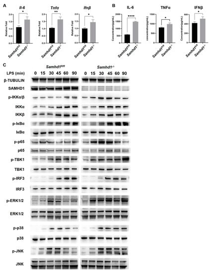 Samhd1 deficiency increased TLR4 signaling and responses in vitro. (A) The mRNA expressions of IL-6, TNFα, and IFNβ were tested with qPCR in peritoneal macrophages from Samhd1−/− and control mice after 3 h LPS stimulation (100 ng/mL). * p < 0.05, ** p < 0.01, Student’s t-test, n = 3/group. (B) The protein expression of IL-6, TNFα, and IFNβ were detected with ELISA in cell supernatants of peritoneal macrophages from Samhd1−/− and control mice after 12 h LPS stimulation (100 ng/mL). * p < 0.05, **** p < 0.0001, Student’s t-test, n = 3/group. (C) The expression and phosphorylation of key proteins in TLR4 pathway were tested with western blotting in peritoneal macrophages from Samhd1−/− and control mice after 0–90 min of LPS stimulation (100 ng/mL).