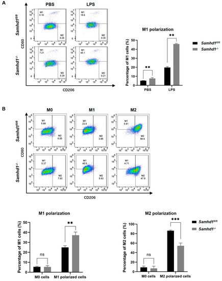 Samhd1 deficiency induces M1 polarization. (A) Representative experiments showing that M1 and M2 polarization of lung macrophages from Samhd1−/− and control mice were detected with flow cytometry 3 h after intraperitoneal injection of LPS (15 mg/kg) or PBS. F4/80+ CD11b+ cells were gated and examined for CD80 and CD206 expression (left). Percentages of CD80+ (M1 phenotype) cells within total F4/80+ CD11b+ subsets are presented as bar graphs (right). ** p < 0.01, Student’s t-test, n = 3/group. (B) Representative experiments showing that M1 and M2 polarization of Samhd1−/− and control macrophages was tested with flow cytometry after 24 h induction of M1 polarization (20 ng/mL IFNγ + 100 ng/mL LPS), M2 polarization (20 ng/mL IL-4), or PBS (used as a sham operation) (upper). CD45+ F4/80+ CD11b+ cells were gated and examined for CD80 and CD206 expression. Percentages of CD80+ (M1 phenotype, down left) cells and CD206+ (M2 phenotype, down right) cells within total CD45+ F4/80+ CD11b+ subsets are presented as bar graphs. ** p < 0.01, *** p < 0.001, Student’s t-test, n = 3/group, ns—not statistically significant.