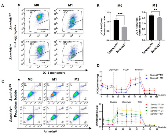 Samhd1 deficiency impairs mitochondrial membrane potential and function. (A,B) Samhd1−/− and control macrophages were labeled with JC-1 after M1-induction for 12 h (PBS was used as a sham operation, represented as M0). (A) The proportions of aggregates and monomers of JC-1 in cells were tested with flow cytometry. (B) Cell fluorescence intensity in red channel (an Ex wavelength of 525 ± 10 nm and an Em wavelength of 590 ± 10 nm) and green channel (an Ex wavelength of 490 ± 10 nm and an Em wavelength of 535 ± 10 nm) was quantified with a fluorescence plate reader and the ratios of red to green fluorescence intensity are presented as bar graphs. ** p < 0.01, *** p < 0.001, Student’s t-test, n = 3/group. (C) Representative experiments of Samhd1−/− and control macrophages in the resting, M1-polarized, and M2-polarized states were tested with flow cytometry for their apoptosis conditions. (D) The oxygen consumption rate (OCR) and extracellular acidification rate (ECAR) were detected with mitochondrial stress assay and glycolysis stress assay, respectively, in Samhd1−/− and control macrophages after 12 h induction of M1 polarization (PBS was used as a sham operation, represented as M0).