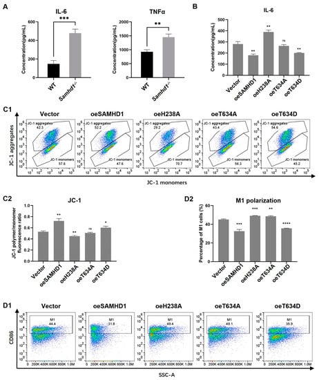 The inhibition of IL-6 and protection of mitochondria were dependent on the dNTPase function of SAMHD1 and regulated by the phosphorylation site T634. (A–D) Samhd1−/− and control RAW264.7 cells were established. (A) The protein expression of IL-6 and TNFα in cell supernatants was detected after 12 h LPS stimulation (100 ng/mL). (B,C) Samhd1−/− RAW264.7 cells were electro-transfected with empty vectors or vectors of full-length SAMHD1 or SAMHD1 mutants such as H238A, T634A, and T634D. After 24 h of transfection, cells were stimulated with LPS (100 ng/mL) for 12 h. (B) The protein expression of IL-6 in cell supernatants was detected and is presented as bar graphs. p value of vector group relative to paired other groups. ** p < 0.01, Student’s t-test, n = 3/group. (C1) Cells were labeled with JC-1, and the proportion of intracellular JC-1 aggregates and monomers was tested with flow cytometry. (C2) Cell fluorescence intensity in red channel (an Ex wavelength of 525 ± 10 nm and an Em wavelength of 590 ± 10 nm) and green channel (an Ex wavelength of 490 ± 10 nm and an Em wavelength of 535 ± 10 nm) were quantified with a fluorescence plate reader and the ratios of red to green fluorescence intensity are presented as bar graphs. * p < 0.05, ** p < 0.01, Student’s t-test, n = 3/group, ns—not statistically significant. (D1) After 24 h of transfection, cells were induced to be M1-polarized (20 ng/mL IFNγ + 100 ng/mL LPS). After another 24 h, M1 polarization of the cells was tested with flow cytometry. Percentage of CD86+ cells was quantified as M1-polarized macrophages. (D2) The percentage of M1-polarized macrophages was detected and is presented as bar graphs. p value of vector group relative to paired other groups. ** p < 0.01, *** p < 0.001, **** p < 0.0001, Student’s t-test, n = 3/group.