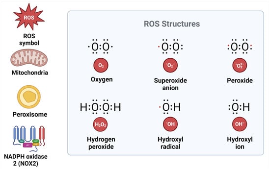 Structure of reactive oxygen species and their sources. ROS, reactive oxygen species; NADPH, nicotinamide adenine dinucleotide phosphate; NOX2, NADPH oxidase.