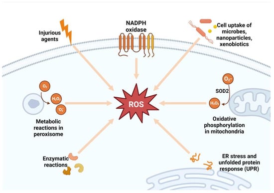 ROS signaling may participate in normal physiological processes or contribute to maladaptive responses that result in metabolic dysfunction and inflammatory signaling, depending on the ROS source, cell type, and tissue environment [,,]. The two major sources of ROS inside the cell are nicotinamide adenine dinucleotide phosphate (NADPH) oxidase (NOX) enzymes and the mitochondria []. The NOX enzymes are a family of enzymes (NOX1, NOX2, NOX3, NOX4, NOX5, DUOX1, and DUOX2) located in the cell membrane, and NOX2-NOX3 is important in most pathological conditions []. In the mitochondria, ROS are formed during oxidative phosphorylation by oxidizing reduced nicotinamide adenine dinucleotide (NADH) to NAD+ [,]. The superoxide anion that is produced by the mitochondria and NOX2 is rapidly converted by an enzyme called superoxide dismutase into hydrogen peroxide (H2O2), which serves as a signaling molecule [,] (Figure 2). Hydrogen peroxide is a powerful oxidizing agent. For this reason, cells express antioxidant proteins, including peroxiredoxin, catalase, glutathione (GSH), and thioredoxin, that convert H2O2 to water [,]. The level of H2O2 must be strictly maintained; hence, its production must be equal to its reduction []. High H2O2 in the presence of free ferric iron (Fe2+) produces hydroxyl radicals (•OH) in the Fenton reaction [,].