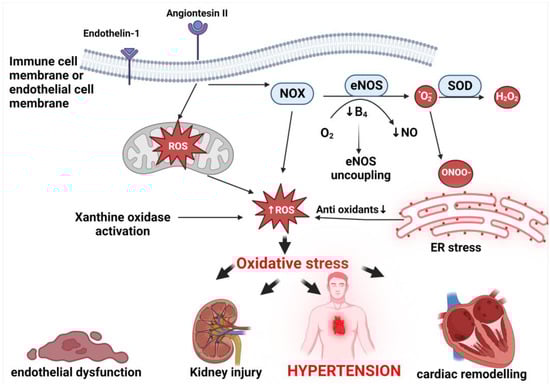 Proposed mechanisms of oxidative stress-induced hypertension. The NOX (NADPH oxidase) family and xanthine oxidase enzymes are the principal generators of reactive oxygen species (ROS) in hypertension, and they are regulated by pro-hypertensive and pro-inflammatory factors such as Ang II (angiotensin II) and ET-1 (endothelin-1). eNOS (endothelial nitric oxide synthase) uncoupling and mitochondrial and endoplasmic reticulum (ER) pathways affected by NOX/ROS also result in the production of ROS. These may result in hypertension due to endothelial damage, renal injury, or cardiovascular dysfunction. SOD, superoxide dismutase; NO, nitric oxide; BH4, tetrahydrobiopterin.
