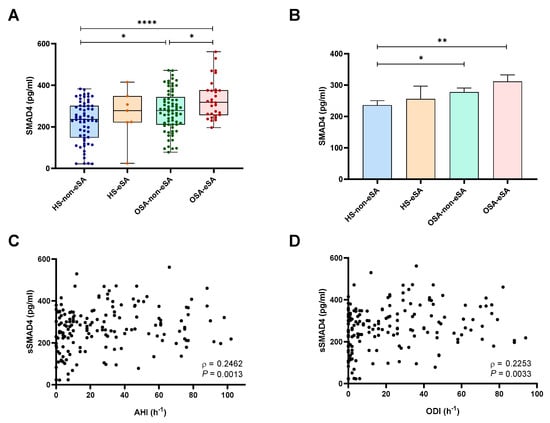 2.3. sSMAD4 Levels Are Elevated in Patients with OSA and eSA and Related to OSA Severity