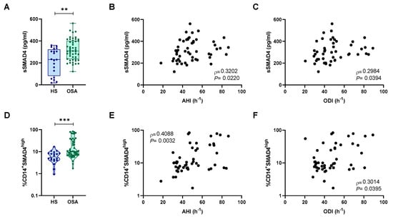 Intracellular expression of SMAD4 is increased in monocytes from OSA patients. (A) sSMAD4 levels in plasma from RC cohort subjects: healthy subjects (HS, n = 20) or OSA patients (OSA, n = 50) determined by ELISA. Comparison between groups was performed by the Mann–Whitney U-test. (B,C) Correlation between sSMAD4 plasma concentration and (B) apnea–hypopnea index [AHI] (n = 50) and (C) oxygen desaturation index [ODI] (n = 50). Spearman’s correlation coefficients (ρ) and p-values are shown. (D) SMAD4 intracellular expression in monocytes from RC cohort subjects: healthy subjects (HS, n = 20) or OSA patients (OSA, n = 50) determined by flow cytometry. Comparison between groups was performed by the Mann–Whitney U-test. (E,F) Correlation between intracellular SMAD4 expression and (E) apnea–hypopnea index [AHI] (n = 50) and (F) oxygen desaturation index [ODI] (n = 50). Spearman’s correlation coefficients (ρ) and p-values are shown. **: p < 0.01, ***: p < 0.001.
