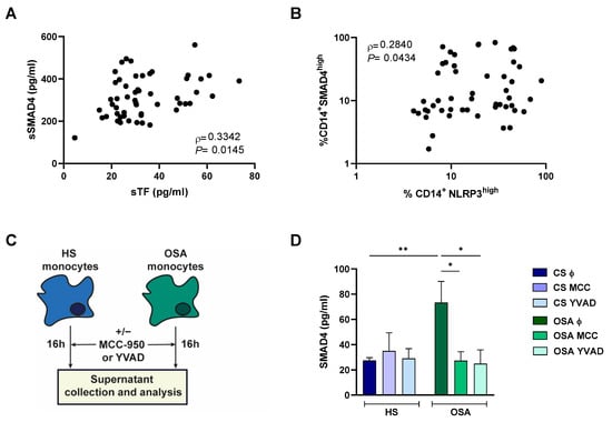 NLRP3 may mediate SMAD4 release to the plasma. (A) Correlation between sSMAD4 and TF plasma concentration in patients from the RC cohort (n = 50) assessed by ELISA. (B) Correlation between SMAD4 and NLRP3 intracellular expression in monocytes from patients from RC cohort (n = 50) assessed by flow cytometry. Spearman’s correlation coefficients (ρ) and p-values are shown. (C) Schematic representation of the ex vivo models, monocytes from healthy subjects (HS, n = 6) or OSA patients (OSA, n = 7) were cultured for 16 h with the presence or absence of the NLRP3 inhibitor MCC-950 (MCC) or the caspase-1 inhibitor Ac-YVAD-cmk (YVAD). (D) SMAD4 supernatant concentration from ex vivo models assessed by ELISA. Mean ± SEM is shown. Comparisons between groups were performed by Two-Way ANOVA with Bonferroni’s multiple comparison test. *: p < 0.05, **: p < 0.01.