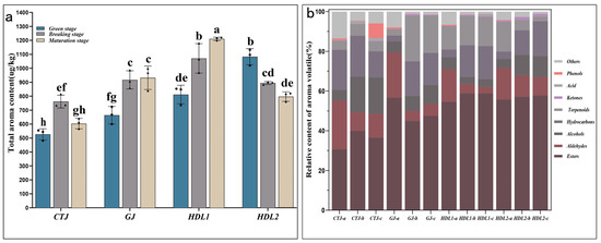 Volatile aroma composition in different samples. (a) Total volatile aroma content (μg/kg) in pepper fruit of different samples. Error bars show ±SE from three biological replicates. Significant differences are shown with different letters above the bars (p < 0.05); (b) the main volatile aroma component categories and their relative content (%) in different pepper fruit samples.