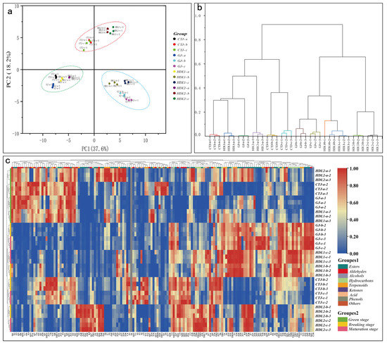 Characterization of VACs from different pepper samples; (a) PCA of VACs from different pepper samples; (b) HCA of VACs in different samples; (c) heat map of the species and relative contents (μg/kg) of volatiles in different samples. (The heatmap was drawn using log2-based relative content values. Red represents high expression, and blue represents low expression).