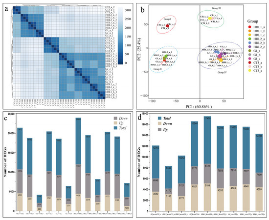 Summary analysis of transcriptomes. (a) Cluster plot of the transcriptome sequencing samples; (b) PCA of 36 pepper fruit samples; (c) the number of DEGs during pepper fruit development; (d) the number of DEGs between the four pepper varieties.