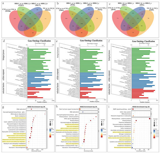 Functional enrichment analysis of DEGs in different developmental stages. (a,b) Venn diagram of the DEGs four in pepper varieties at different growth periods; (d–f) gene ontology (GO) classifications of overlapping DEGs in (a–c); (g–i) Kyoto Encyclopedia of Genes and Genomes (KEGG) pathway enrichment of DEGs in (a–c).