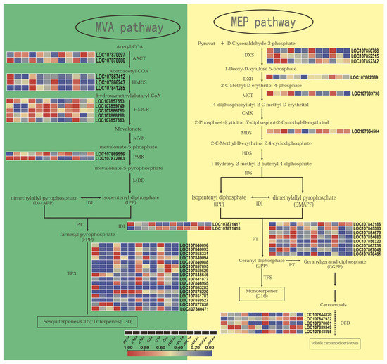 Expression profiles of volatile-related genes involved in the MVA (left) and MEP (right) metabolic pathways in the different pepper fruit samples (red represents high expression, and blue represents low expression). AACT: acetoacetyl-CoA thiolase; HMGS: 3-hydroxy-3-methyl-glutaryl-CoA synthase; HMGR: 3-hydroxy-3-methylglutaryl-CoA reductase; MVK: mevalonate kinase; PMK: phosphomevalonate kinase; MDD: mevalonate-5-diphosphate decarboxylase; IDI: isopentenyl pyrophosphate isomerase; DXS: 1-deoxy-D-xylulose 5-phosphate synthase; DXR: 1-deoxy-D-xylulose 5-phosphate reductoisomerase; MCT: 2-C-methyl-D-erythritol 4-phosphate cytidylyltransferase; CMK: 4-(cytidine 5′-diphospho)-2-C-methyl-D-erythritol kinase; MDS: 2-C-methyl-D-erythritol 2,4-cyclodiphosphate synthase; HDS: 4-hydroxy-3-methylbut-2-en-1-yl diphosphate synthase; IDS: isopentenyl diphosphate synthase; PT: prenyl transferase; TPS: terpene synthase; CCD: carotenoid cleavage dioxygenase.