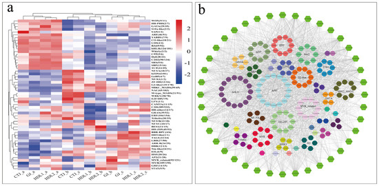 To gain insight into the molecular mechanisms regulating the formation of VACs in pepper fruits, we constructed gene networks and co-expression analysis using non-redundant DEGs. The results showed that these DEGs were clustered into ten major modules, and genes in the same module showed higher co-expression and correlation relationships. The correlation analysis between the gene module and trait module with 70 differential VACs as phenotypic traits showed that (Figure 9a) the dark-olive-green module was positively correlated with the accumulation of most aroma components, while the light-yellow module was negatively correlated with the most VACs. The genes in these two modules were used for further cluster analysis, and the results showed that the genes in the dark-olive-green module (Figure 9b) had lower expression levels in CTJ than in other samples, while the genes in the light-yellow module showed the opposite expression patterns, higher expression of genes was mainly in CTJ (Figure 9c).