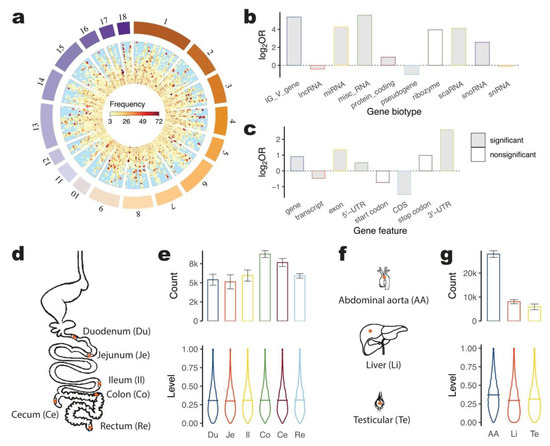 Our study began with a total of 72 samples from eight individuals and encompassed nine tissues, including duodenum (Du), jejunum (Je), ileum (Il), colon (Co), cecum (Ce), rectum (Re), abdominal aorta (AA), liver (Li), and testis (Te). The samples were sequenced using strand-specific, rRNA-free, and pair-end platforms (Table S1). RNA editing analysis was performed using REDItools2, and all types of RNA editing were detected. Sites were filtered based on known SNPs, individual genome variations, fewer than three samples, and 100% editing levels in all detected samples, resulting in 1,011,050 (average (ave.) 14,042.4) high-quality autosomal RNA eating sites across 72 samples. These sites were found to be located in 94,259 non-redundant positions in the pig genome. Among them, 64,367 (68.3%) corresponded to AG modification or A-to-I editing, with an average of 8962.5 for each of 72 (645,301 for all) samples (Figure 1a and Figure S1a, Table S2). The editing level of each site was defined as the proportion of editing reads in the total sequenced reads and was used to quantify the editing dosage for each site. The editing level of the editing sites for each type is presented in Figure S1b. The majority of these sites (62.8%) were unevenly distributed in the middle of chromosomes, as shown in Figure S1c,d. In all 72 samples, A-to-I editing sites were found to have an average editing level of 0.33, with a clustering tendency that was most prevalent within 20 base pairs of each other (Figure S1e). Over 60,000 A-to-I editing sites were detected across all 72 samples, with the editing level peaking at around 0.25, as presented in Figure S1f. The frequency distribution of A-to-I sites, depicted in Figure S1g, revealed that the majority of sites (17.7%) were detected in only three samples. To explore the functional aspects of A-to-I editing sites in pigs, we annotated 64,367 non-redundant sites against gene regions using the Ensembl gene annotation file. Among these sites, 55,986 (87.0%) were located in annotated regions, with enrichment observed in protein-coding genes and regions transcribing RNAs that regulate gene function, such as miRNA, miscRNA, scaRNAs, and snoRNA (Figure 1b and Figure S2a, Table S3). Of the 55,986 A-to-I editing sites in the annotated region, 96.2% were located in 14,226 transcripts of 5251 PCGs. These sites were distributed across different gene features, including exons, start and stop codons, 5′-UTRs, CDSs, and 3′-UTRs (Figure S2b). A-to-I editing sites were significantly enriched in 5′-UTR and 3′-UTR, whereas sites in CDS were significantly lower than the expectation when compared with the total length of gene features in the pig genome (Figure 1c). These findings suggest that A-to-I editing plays a role in regulating gene function.