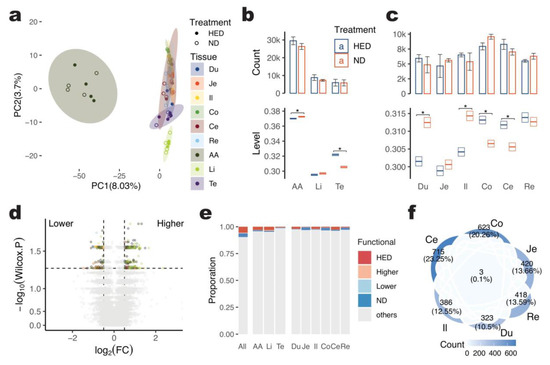 We conducted pair-wise comparisons between HED and ND pigs for each of the nine tissues using the Wilcox Test method. We focused on 19,629 A-to-I editing sites that were represented in at least three samples for each treatment of tissue and found that 433 sites (2.2%) showed a significant difference (p < 0.05) between HED and ND across tissues (Figure 2d). Among these sites, 278 (64.2%) showed increased editing levels after HED treatment, while 155 (35.8%) showed decreased levels. For A-to-I editing sites that were only detected in one treatment of tissue and not in the other treatment samples of the same tissue, we defined them as treatment-specific editing sites of that tissue. Across the nine tissues, we detected a total of 3550 HED-specific and 2191 ND-specific editing sites (Figure S3a and Table 2), making up 9.4% (6041/64,367) of the functional A-to-I editing sites detected as being different or specific to HED or ND treatment across tissues. The highest count of such sites was found in the abdominal aorta (4.2%, 2027/47,931), while the highest proportion was in the liver (4.7%, 823/17,375) (Figure 2e).