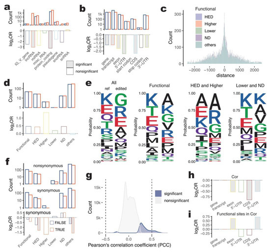 A-to-I editing occurring in the coding sequences (CDSs) of transcripts can lead to amino acid substitutions. To study the functional characteristics of A-to-I editing involving protein-coding changes, we compared the amino acid sequence before and after editing for 763 A-to-I sites in the CDSs of 1056 proteins. The amino acid composition changed significantly after A-to-I editing, both for all A-to-I sites and for functional A-to-I sites (Figure 3e). Among these sites, 703 (66.6%) resulted in nonsynonymous changes, and 488 (46.2%) resulted in synonymous changes, with 135 proteins (12.8%) having different isoforms depending on the protein they encoded (Figure 3f and Table S7). However, the amino acid composition varied between HED, Higher and Lower, and ND. We checked for the enrichment of functional A-to-I editing sites in CDSs and found that neither nonsynonymous nor synonymous changes were significantly enriched in this analysis.