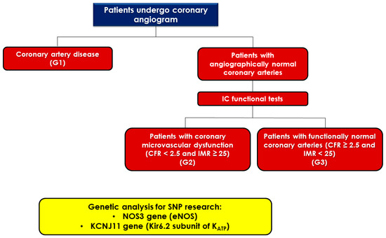 Flow chart representing study design. Patients underwent a coronary angiogram (CAG) due to suspected or confirmed acute or chronic ischemic heart disease. They were divided into 3 groups according to the CAG results: G1 (patients with coronary artery disease), G2 (patients with coronary microvascular dysfunction), and G3 (patients with angiographically and functionally normal coronary arteries). A peripheral blood sample was taken from each patient for genetic analysis and single nucleotide polymorphisms of KCNJ11 and NOS 3 research. IC: intracoronary; CFR: coronary flow reserve; IMR: index of microvascular resistance; SNPs: single nucleotide polymorphisms; NOS3: nitric oxide synthase 3; eNOS: endothelial nitric oxide synthase; KCNJ11: potassium inwardly rectifying channel subfamily J member 11; KATP: ATP sensitive potassium channels.
