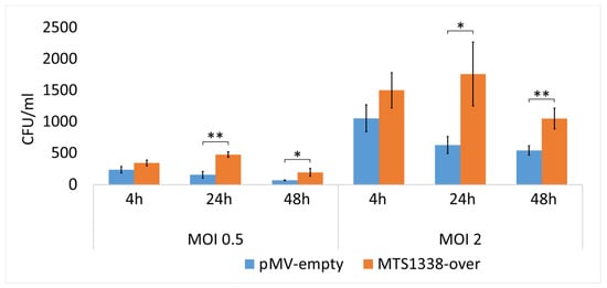 To analyze the biological effect of MTS1338 expression in Mtb, THP-1 cells differentiated into macrophages were infected with MTS1338-transformed (MTS1338-over) and empty vector-transformed (pMV-empty) mycobacteria in the logarithmic phase. The results revealed that the MTS1338-over strain, in which MTS1338 expression was significantly upregulated [], had increased survival compared with the control strain at both time points (24 and 48 h after infection) and MOI values (0.5 and 2) (Figure 1), indicating enhanced resistance of MTS1338-overexpressing mycobacteria against stress conditions existing in the cytosol of infected macrophages.