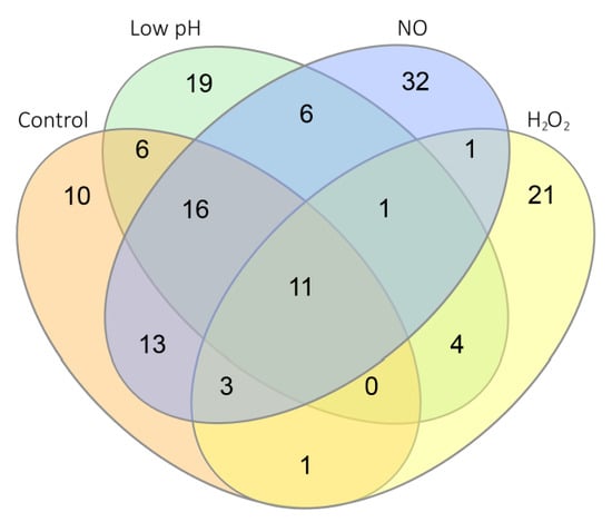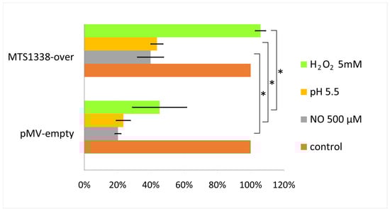 MTS1338-overexpressing Mtb in the stationary phase is more resistant to low pH than the control (empty vector) strain [], but the stress-protective effects of MTS1338 overexpression in the logarithmic phase appear to be more pronounced. While in the stationary cultures, the effects of H2O2 and NO on the Mtb metabolic activity are negligible, in the logarithmic cultures, they are significant (Figure 2).