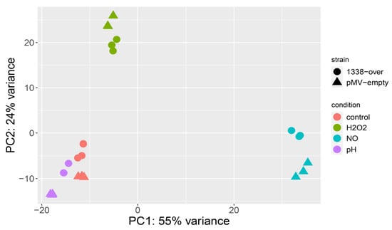 Principal component analysis (PCA) of the transcriptional profiles of the two strains revealed that the same stress factor caused similar effects in both, indicating that the influence of MTS1338 overexpression on gene transcription was less significant than that of stresses (Figure 3). Common differentially expressed genes for both the MTS1338-over and pMV empty strains after 24 h subjection to each stress factor in comparison to MTS1338-over and pMV empty logarithmic-phase liquid cultures without stress exposure are listed in Table S5.