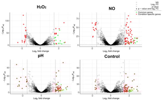 Transcriptional differences between MTS1338-overexpressing and pMV-empty strains in stressful and ‘no stress’ (control) conditions. Unfilled circles indicate genes with log2FC ≤ 1.5 and/or padj > 0.1, filled circles—genes with log2FC > 1.5 and padj < 0.1, red circles—condition-specific DEGs, and green circles—common genes in all the conditions tested.