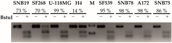 Methylation status of the MGMT promoter in GBM cell lines. Genomic DNA was extracted and treated with bisulfite; the MGMT promoter region was amplified by PCR, digested with BstUI, and visualized by agarose gel electrophoresis as described in Section 4. For semiquantitative evaluation, the percentage of cleaved (methylated) DNA was determined using ImageJ software (version 1.53t). M = molecular weight marker.