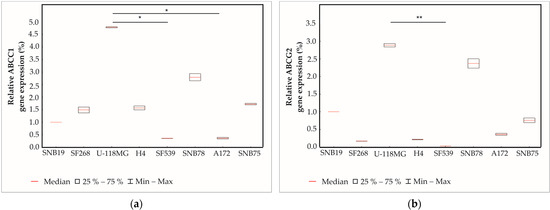 Box plots representing ABCC1 (a) and ABCG2 (b) gene expressions. Box plots have box boundaries ranging from the 25–75% percentiles, center line represents the median, and the whiskers illustrate the minimum and maximum of the data points. Significant results are presented as * p < 0.05, ** p < 0.01.