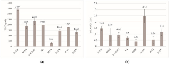 Comparison of IC50 values of different GBM cell lines treated with TMZ (a) or MLN4924 (b) for 48 h. GBM cell lines were treated for 48 h with different concentrations of TMZ or MLN4924 and the cell viability was measured by the ATP assay as described in Section 4. IC50 values were calculated based on the results of these experiments. Each bar represents the mean of three independent experiments, and error bars denote the standard deviation of the mean.