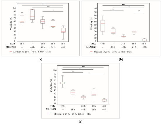 Box plots representing the effects of TMZ or MLN4924 treatments alone, or in combination in SNB19 (a), H4 (b), and SF539 (c) cell lines. The results of three independent experiments are shown. Box plots have box boundaries ranging from the 25–75% percentiles, the center line representing the median, and whiskers illustrating the minimum and maximum of the data points. Significant results are presented as * p < 0.05, ** p < 0.01, *** p < 0.001.
