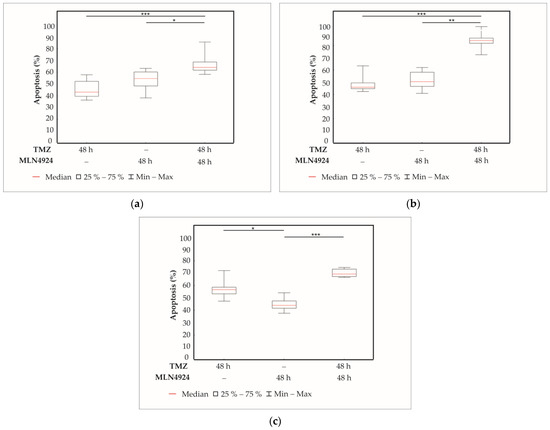 Analysis of the rate of apoptosis in SNB19 (a), H4 (b), and SF539 (c) cell lines. Cells were treated with the appropriate IC50 concentrations of TMZ and MLN4924 either alone or in combination (48 h TMZ + 48 h MLN4924) for 48 h. Cells were fixed and then stained with Hoechst 33342 dye. 200 cells per sample were counted in randomly chosen view fields using a fluorescence microscope. The rate of apoptosis was calculated as the percentage of the counted cells. At least 5 independent experiments were performed. Box plots have box boundaries ranging from the 25–75% percentiles, the center line represents the median, and the whiskers illustrate the minimum and maximum of the data points. Significant results are presented as * p < 0.05, ** p < 0.01, *** p < 0.001.