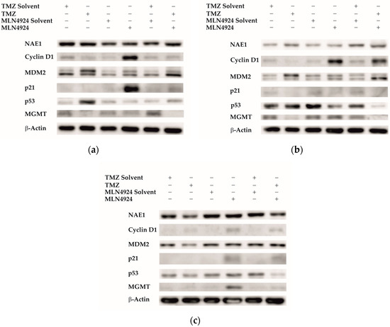 Western blot analysis of proteins involved in the neddylation pathway and TMZ-resistance in SNB19 (a), H4 (b), and SF539 cells (c). Cells were treated with the solvent of the agents or with the appropriate IC50 concentrations of TMZ and MLN4924 either alone or in combination (48 h TMZ + 48 h MLN4924) for 48 h. Western blot analysis was performed according to Section 4. β-actin was used as a loading control. At least three independent experiments were performed. Representative blots are shown.