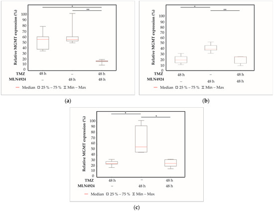Box plots representing the quantitative analysis of the MGMT immunocytochemistry of TMZ or MLN4924 treatments alone, or in combination in SNB19 (a), H4 (b), and SF539 (c) cell lines. Data were normalized to the untreated control samples. The results of 3 independent experiments are shown. Box plots have box boundaries ranging from the 25–75% percentiles, the center line represents the median, and the whiskers illustrate the minimum and maximum of the data points. Significant results are presented as * p < 0.05, ** p < 0.01.