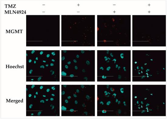Detection of MGMT expression after single (48 h TMZ, 48 h MLN4924) and combination (48 h TMZ + 48 h MLN4924) treatments in SNB19 cells. Indirect immunocytochemistry was performed as described in Section 4. The red color indicates the presence of MGMT protein (upper panels), the blue color indicates cell nuclei stained by Hoechst 33342 (middle panels), and merge images are shown on the lower panels. The scalebar represents 100 μm. Representative images are shown.