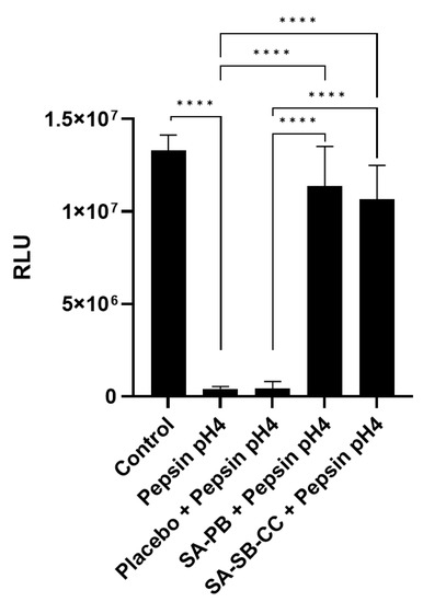 Figure 1. Effect of 1 h pepsin-acid treatment on cell viability and protection by alginate. Statistical analysis was performed on 8 replicates (n = 8) per condition, presented as mean ± SD, using multiple Student’s t-tests for comparisons between two groups. Conditions (pretreatment/treatment): Control (HBSS/HBSS); Pepsin pH4 (HBSS/pepsin pH4); Placebo + Pepsin pH4 (placebo/pepsin pH4), SA-PB + Pepsin pH4 (sodium alginate potassium bicarbonate/pepsin pH4), SA-SB-CC + Pepsin pH4 (sodium alginate, sodium bicarbonate, calcium carbonate/pepsin pH4). RLU = Relative luminescent units; error bars = SD; **** p < 0.0001.