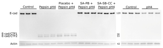 Figure 2. Effect of 30 min pepsin-acid treatment on E-cadherin regulated intramembrane proteolysis (RIP) and protection by alginate. Conditions (pretreatment/treatment): Control (HBSS/HBSS); Pepsin pH4 (HBSS/pepsin pH4); Placebo + Pepsin pH4 (placebo/pepsin pH4), SA-PB + Pepsin pH4 (sodium alginate potassium bicarbonate/pepsin pH4), SA-SB-CC + Pepsin pH4 (sodium alginate, sodium bicarbonate, calcium carbonate/pepsin pH4), pH4 (HBSS/HBSS pH4). E-cad = E-cadherin, CTF = C-terminal fragment.