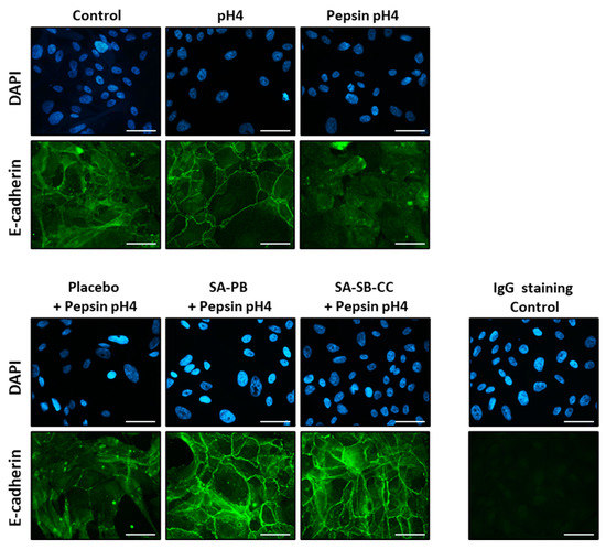 Cells were immunostained using an anti-E-cadherin N-terminal antibody and methods adapted from those described previously [117]. Briefly, cells were grown on collagen-coated coverslips (Neuvitro Corporation, Camas, WA). Cells were pretreated (in dilute SA-PB, SA-SB-CC or placebo in HBSS), washed, and treated (in HBSS pH7.4 or HBSS pH4 ± 1 mg/mL porcine pepsin) at 37 °C/5% CO2 for 30 min as described above. Cells were then fixed in 4% paraformaldehyde (Electron Microscopy Services, Hattfield, PA) in PBS for 15 min, washed twice in PBS, and blocked for 2 h in blocking buffer (PBS, 5% normal goat serum (Cell Signaling Technology, Danvers, MA, USA), 50-mM ammonium chloride), and then incubated in an anti-E-cadherin N-terminal antibody (HECD1; ThermoFisher Scientific) or mouse immunoglobulin (negative control; Santa Cruz Biotechnology, Dallas, TX, USA) in 1× PBS, 1% bovine serum albumin for 1.5 h at room temperature. Coverslips were washed three times in PBS and blocked for 30 min in blocking buffer with 0.1% Tween-20. Primary antibodies were detected by 1 h incubation with Alexa Fluor 488 goat anti-mouse IgG H+L (ThermoFisher Scientific) at room temperature. Slides were washed in PBS before a water rinse and mounting to slides using Prolong Diamond Antifade Reagent with DAPI (ThermoFisher Scientific). The experiment was performed in duplicate; representative images were collected at 630x magnification with constant exposure for biomarkers of interest using an Axioscope 5 microscope (ZEISS, Oberkochen, Germany).