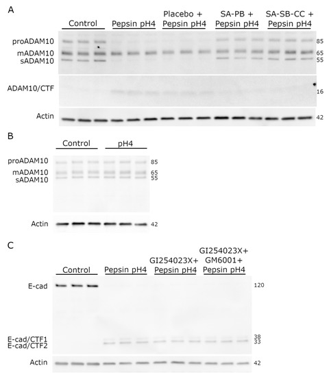 Figure 4. Role of known E-cadherin sheddases, ADAM10 and metalloproteinases, in pepsin-induced E-cadherin RIP. (A,B) Effects of 30 min pepsin-acid treatment and alginate pretreatment on maturation of ADAM10, a major E-cadherin sheddase. Conditions (pretreatment/treatment): Control (HBSS/HBSS); Pepsin pH4 (HBSS/pepsin pH4); Placebo + Pepsin pH4 (placebo/pepsin pH4), SA-PB + Pepsin pH4 (sodium alginate potassium bicarbonate/pepsin pH4), SA-SB-CC + Pepsin pH4 (sodium alginate, sodium bicarbonate, calcium carbonate/pepsin pH4), pH4 (HBSS/HBSS pH4). (C) Effect of inhibition of ADAM10 (by GI254023X) and other metalloproteinases (by GM6001, broad spectrum inhibitor) on pepsin-induced E-cadherin RIP. Conditions (pretreatment/treatment): Control (HBSS/HBSS); Pepsin pH4 (HBSS/pepsin pH4); GI254023X + Pepsin pH4 (GI254023X/pepsin pH4 + GI254023X); GI254023X + GM6001 + Pepsin pH4 (GI254023X + GM6001/pepsin pH4 + GI254023X + GM6001). mADAM10 = mature ADAM10, sADAM10 = ADAM10 secreted ectodomain, E-cad = E-cadherin, CTF = C-terminal fragment.
