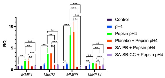 Figure 5. Effect of 15 min pepsin-acid stimulation on MMP mRNA expression 24 h post-treatment and protection by alginate. Statistical analysis was performed on 3 replicates (n = 3) per condition, presented as mean ± SD, using multiple Student’s t-tests for comparisons between two groups. Conditions (pretreatment/treatment): Control (HBSS/HBSS); pH4 (HBSS/HBSS pH4); Pepsin pH4 (HBSS/pepsin pH4); Placebo + Pepsin pH4 (placebo/pepsin pH4), SA-PB + Pepsin pH4 (sodium alginate potassium bicarbonate/pepsin pH4), SA-SB-CC + Pepsin pH4 (sodium alginate, sodium bicarbonate, calcium carbonate/pepsin pH4). RQ = Relative quantity; error bars = SD; *** p < 0.001; ** p < 0.01; * p < 0.05.