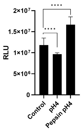 Figure 6. Effect of 15 min pepsin-acid stimulation on cell proliferation over 48 h. Statistical analysis was performed on 24 replicates (n = 24) per condition, presented as mean ± SD, using multiple Student’s t-tests for comparisons between two groups. RLU = Relative luminescent units; error bars = SD; **** p < 0.0001.
