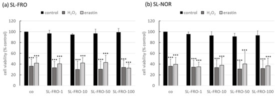 Oxidative stress assay with ARPE-19. Human retinal pigment epithelium cell line ARPE-19 was treated with 1, 10, 50, or 100 µg/mL SL-FRO or SL-NOR and/or 250 µM H2O2 or 20 µM erastin at subconfluence for 24 h. After that, cell viability was assessed with a tetrazolium bromide assay (MTT). Absorption values were calculated relatively to the untreated control, set to 100%. Data were normally distributed (Shapiro–Wilk test) and one-sample t-test was conducted. *** p ≤ 0.001 (compared to co); co = control, n = 4 (number of independent experiments).