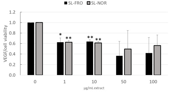 VEGF secretion in RPE. Primary porcine retinal pigment epithelium cells (RPE) were treated with 1, 10, 50, and 100 µg/mL SL-FRO or SL-NOR at confluence for seven days. Tetrazolium bromide assay (MTT) was conducted to assess cell viability. Supernatants were collected for four hours and investigated with ELISA for secreted vascular endothelial growth factor A (VEGF-A). VEGF in pg/mL was calculated in % to control and was normalized with cell viability data in % control. Data was normally distributed (Shapiro–Wilk test) and one-sample t-test was conducted. * p ≤ 0.05, ** p ≤ 0.01 (compared to 0 µg/mL fucoidan), n = 3 (number of independent experiments).