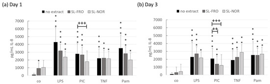 Interleukin 8 secretion of RPE. Primary porcine retinal pigment epithelium cells (RPE) were treated at confluence with 50 µg/mL SL-FRO or SL-NOR with and without 1 µg/mL lipopolysaccharide (LPS), 10 µg/mL polyinosinic:polycytidylic acid (PIC), 50 ng/mL tumor necrosis factor alpha (TNF), or 10 ng/mL Pam2CSK4 (Pam) for one (a) and three days (b). Supernatants were collected for 24 h and applied in ELISA for interleukin 8 (IL-8) measurement in pg/mL secreted protein. Data was normally distributed (Shapiro–Wilk test) and ANOVA with Dunnett’s test was used to evaluate significances. * p ≤ 0.05, ** p ≤ 0.01, *** p ≤ 0.001 (compared to co); ++ p ≤ 0.01, +++ p ≤ 0.001 (compared to stress control); co = control, n = 7 (number of independent experiments).