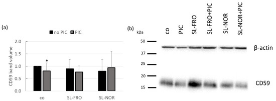 CD59 protein expression of RPE. Primary porcine retinal pigment epithelium (RPE) cells were treated with 50 µg/mL SL-FRO or SL-NOR with and without 10 µg/mL polyinosinic:polycytidylic acid (PIC) for three days. Cell lysates were applied in western blot to assess CD59 (protectin, 18 kDa) and β-actin (48 kDa) expression. An exemplary blot is shown (b). Band volumes were evaluated with TotalLab. CD59 volumes were normalized with data of β-actin. Data was calculated relative to control (set to 1.0, (a)). Data was normally distributed (Shapiro–Wilk test). Significances were evaluated with one-sample t-test. * p ≤ 0.05 (compared to co); co = control, n = 5 (number of independent experiments).