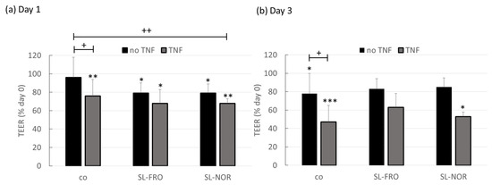 Primary porcine RPE cells were seeded on 12-transwell plates. Transepithelial electrical resistance (TEER) was measured at day 0 (before treatment) immediately before the cells were treated with 50 µg/mL SL-FRO or SL-NOR and/or 50 ng/mL TNF. TNF was chosen, as we previously have shown that TNF reduces barrier function in primary RPE [22]. TEER was measured again after one and three days. TEER was calculated in relation to the corresponding day 0 values, set to 100% (Figure 9).