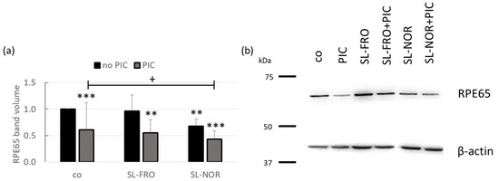 Protein expression of RPE65 (Figure 10) in primary porcine RPE was determined in western blotting. Cells were treated with 50 µg/mL SL-FRO or SL-NOR with and without 10 µg/mL PIC for three days. Band volumes were densitometrically evaluated. Band volumes of RPE65 were normalized with data of β-actin. Data were set in relation to untreated control, set to 1.0. Exemplary blots are depictured in Figure 10b.