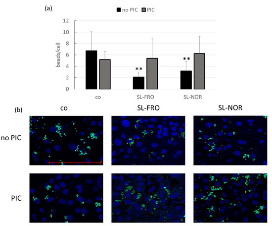 RPE phagocytosis. Primary porcine pigment epithelium (RPE) cells were treated with 50 µg/mL SL-FRO or SL-NOR with and without 10 µg/mL polyinosinic:polycytidylic acid (PIC) for three days. To measure phagocytosis, fluorescent beads opsonized with photoreceptor outer segments were added to the cells (green dots, (b)). Cells were fixated with paraformaldehyde and treated with Fluoromount-G™ and 4′,6-diamidino-2-phenylindol (DAPI) to mark cell nuclei (blue circles, (b)). Photos were taken with an immunofluorescence microscope (640× magnification, red scale bar = 100 µm). Nuclei were counted manually and beads with Fiji Software (ImageJ2). Number of beads was put in relation to the cell nuclei (a). Data were normally distributed (Shapiro–Wilk test). Significances were determined with analysis of variance (ANOVA) and post-hoc Dunnett’s multiple comparison test. ** p ≤ 0.01 (compared to co), co = control, n = 15 (number of independent experiments).