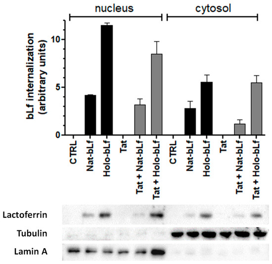 Depending on the biological system, Lf has been demonstrated to exert its multiple functions by interacting with different cell surface receptors [28], leading either to intracellular signaling cascades or to receptor-mediated endocytosis and translocation to the cell nucleus. Hence, we first analyzed Lf internalization and subcellular localization in U373 cells, either expressing the Tat protein or not. No expression of endogenous Lf in these cells was detected. After 24 h of treatment, both Nat- and Holo-bLf were efficiently internalized by U373 cells, independently from Tat expression (Figure 1). bLf targeted both nuclear and cytoplasmic compartments, with higher levels of Holo-bLf detected in both U373 and U373-Tat cells.