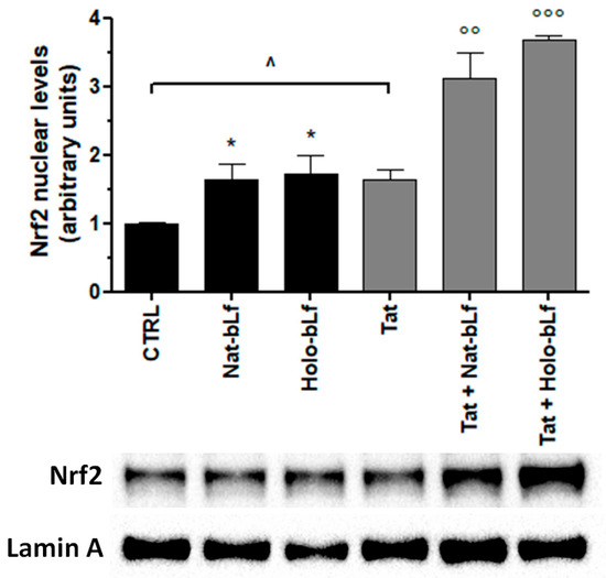 Analysis of Nrf2 nuclear translocation. Western blot and densitometric analysis of Nrf2 protein levels in nuclear extracts of U373 and U373-Tat cells after 4 h of treatment with 100 μg/mL of Nat-bLf or Holo-bLf. Data are calculated relative to the internal housekeeping gene (Lamin A) and are expressed as the means ± SEM. One-way ANOVA, followed by Tukey’s test, was used to determine significant differences. * p ≤ 0.05 vs. CTRL; °° p ≤ 0.01 and °°° p ≤ 0.001 vs. Tat; ^ p ≤ 0.05 between Tat and CTRL.
