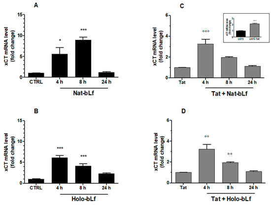 Analysis of System Xc− transcript levels. Real-Time qPCR analysis of System Xc− mRNA in U373 (A,B) and U373-Tat (C,D) cells after 4, 8, and 24 h of treatment with 100 μg/mL of Nat-bLf or Holo-bLf. Data are calculated relative to the internal housekeeping gene (GAPDH) and are expressed as the means ± SEM. One-way ANOVA, followed by Tukey’s test, was used to determine significant differences. * p ≤ 0.05 and *** p ≤ 0.001 vs. CTRL; °° p ≤ 0.01 and °°° p ≤ 0.001 vs. Tat; ^^^ p ≤ 0.001 between U373-Tat and U373 (inset).